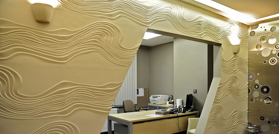 A presumptuous reception hall with an asymmetric design wall and a special casting technique on it